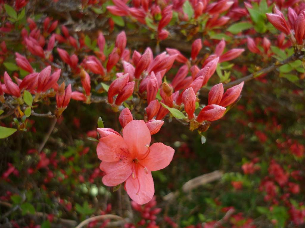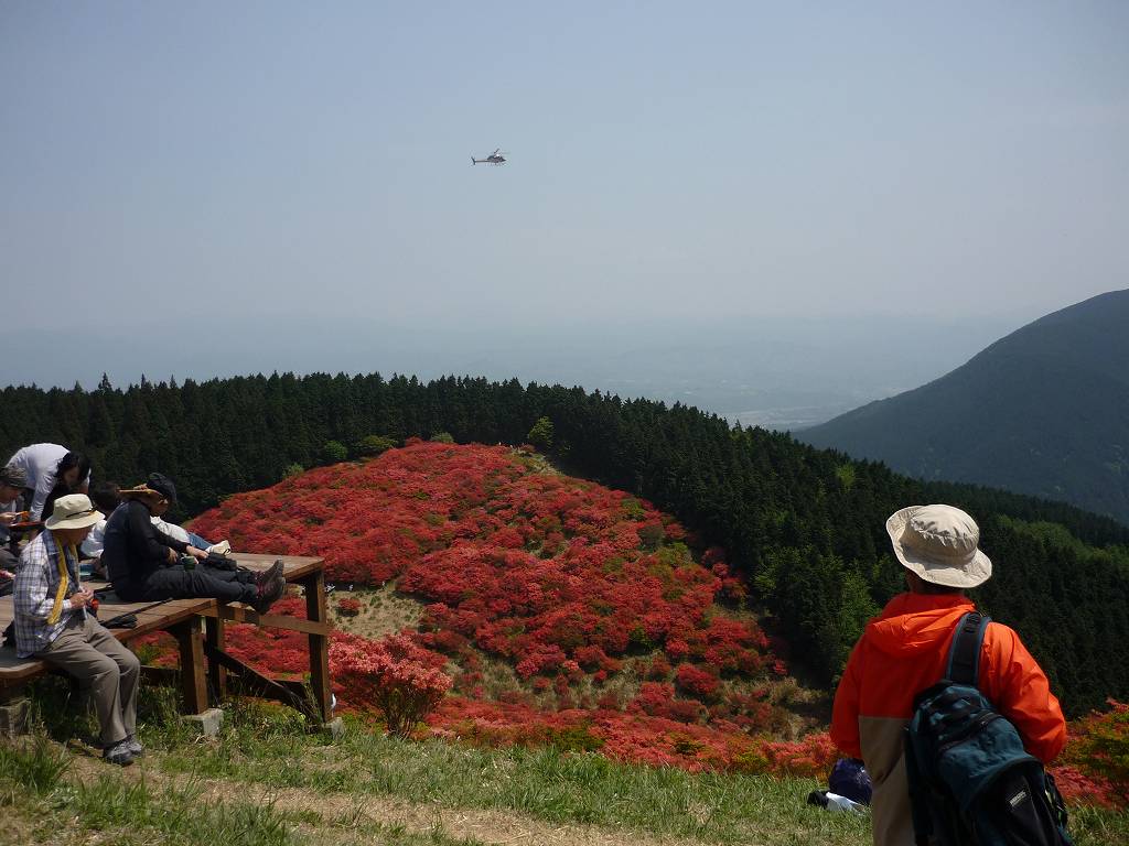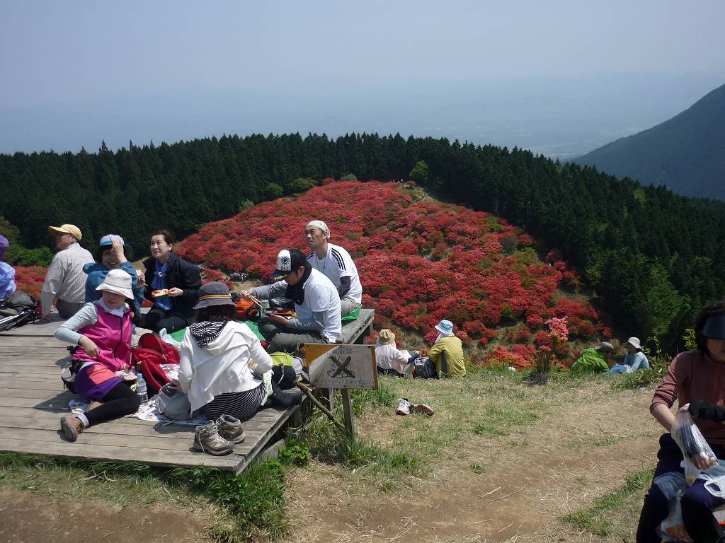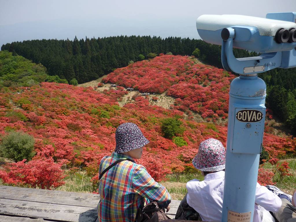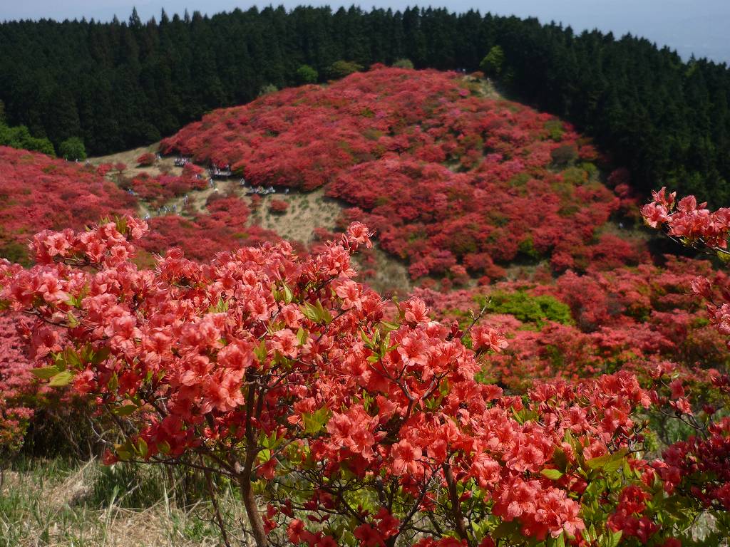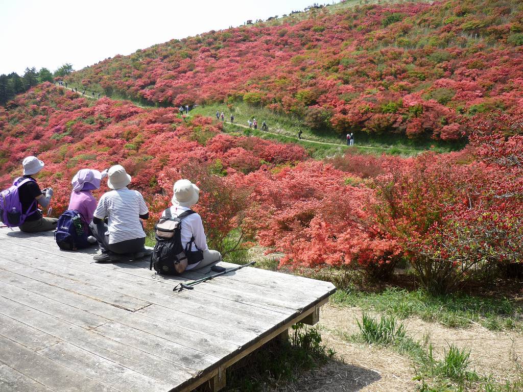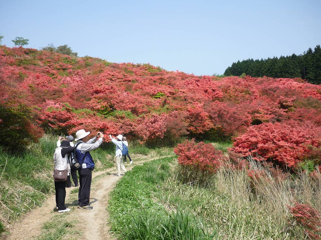 見渡す限り一面の赤いツツジで真っ赤色 疲れ忘れて見入る 歩き廻る