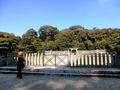 [概要] 明治45年(1912年)7月30日、明治天皇が崩御。同年(大正元年)9月13日に東京・青山の帝國陸軍練兵場(現在の神宮外苑)にて大喪の礼が執り行なわれた後、9月14日に埋葬された。 古式に範を採ったとされる上円下方式で、墳丘にはさざれ石が葺かれている。すぐ東には昭憲皇太后の伏見桃山東陵(ふしみももやまのひがしのみささぎ)が隣接する。 敷地は豊臣秀吉の築いた伏見城の本丸跡地で、京都に墓所が営まれたのは明治天皇の遺言によるものという。周囲一帯は宮内庁の管理地となっており、京都市南西部から旧山陽道、旧西海道地域の陵墓を管理する宮内庁書陵部桃山陵墓監区事務所がある。 墳丘は、上円下方墳で、下段の方形の一辺約60メートル、上円の高さ6.3メートル。方形の墓坑を掘って内壁をコンクリートで固め、その中に棺を入れた木槨を納めた。槨内の隙間には石灰を、石蓋をしてコンクリートで固めた。上円下方墳の墳形は天智天皇陵がモデルにされたという。幕末の孝明天皇についで火葬にせず、天武天皇以前の古制に戻した。 大正天皇以降の天皇・皇后の陵は東京都八王子市に作られたため、近畿地方以西に作られた最後の天皇陵である。(「Wikimedia」より転載) |