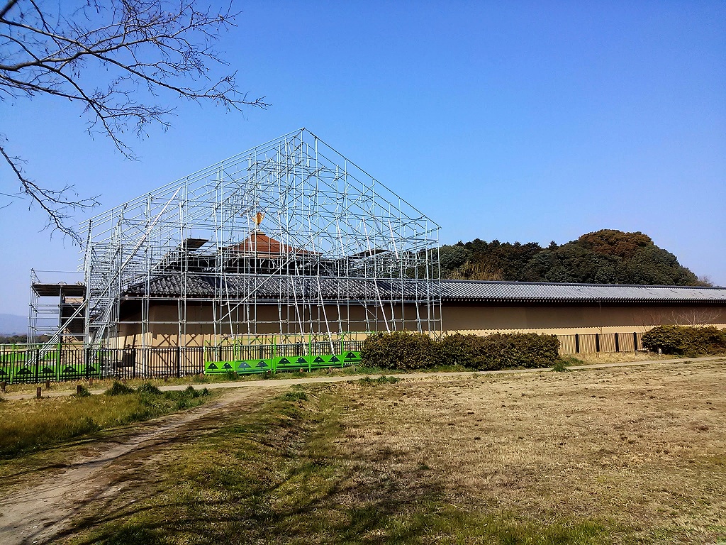 東院庭園にある隅楼が足場を組み立てて修復中。