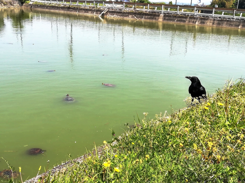 亀にお菓子を投げていたら、カラスが強請って寄ってくる。