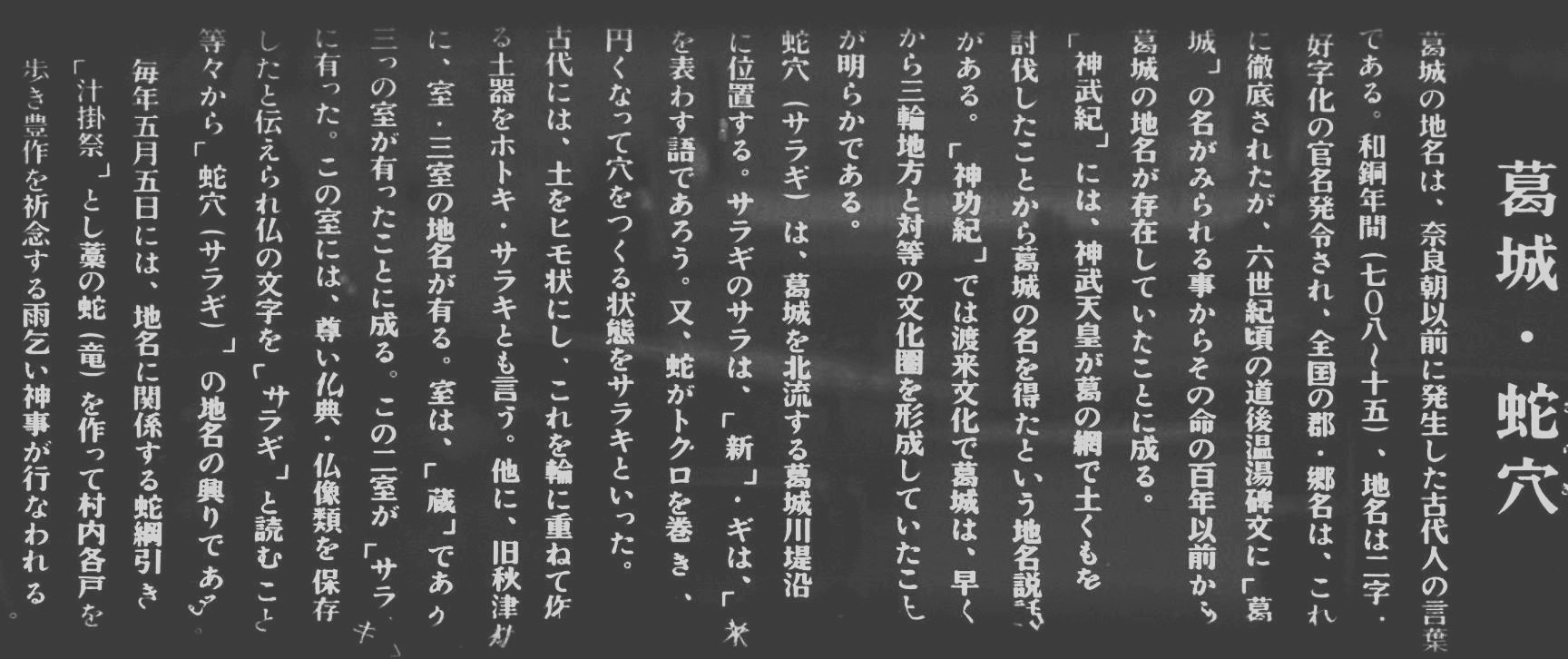 汁掛祭(蛇綱引き)本神社の御祭神は古く神倭伊波礼毘古命及び彦八井命の二神を御祭りされ、それは作物の収穫を掌る水の神(竜神)という御神名で葛城川岸辺に鎮めまつったことから始まる本社は、五穀豊穣を祈願される他、邪気をはらい、諸々の病を除く御守護を賜ることから多くの人々の信仰をあつめている。五月五日に汁掛祭・蛇綱引きが行われる。祭典当日3斗3升3合の味噌でワカメ汁を作り参詣者に汁をかけ厄除を作法とする。他方5月4日の午前から藁で蛇の頭を組み5日に早朝から蛇の胴を作りあげる。体長約十四メートルにも成る。汁掛作法が終わると御神体を先頭に善男善女が村中の一軒一軒蛇綱をひき廻り家々の邪気払い、病除を祈願していく。こうして巡行が終わると神社の蛇塚に蛇綱をトグロに巻き納め行事が終了し、御神体を次番の頭屋に送られ祭がおわる。この祭の由来は神社社記によると、彦八井命の後胤、茨田(ホッタ)の長者が河内の国よりこの地に住んでいた。そこに一人の娘がいた。その頃、茅原郷から葛城山に修行に日参する役の行者小角が居たが、修行の往復に村の筋街道を通るのが常であった。いつしかその娘の恋の的になったが、行者は修行一途で応じることが無く、娘は女の一念から悪息をはきながら行者を呑み込もうと村の森の中にある「穴」にかくれた。5月5日の田植時で村人が野良へ弁当をもって通りかかると、大蛇が火を吹いていた。驚いて持っていた味噌汁を大蛇にぶっかけて逃げ帰った。村人がきて見ると、大蛇が井戸の中に入ったので巨石で口をふさいだ。その後娘の供養にと汁掛祭と蛇綱ひきが行われている。