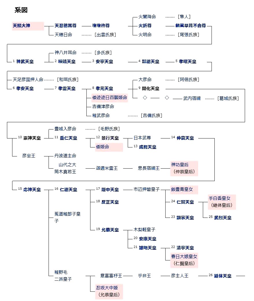 ※ 古事記に関連ある場所では、その記載箇所を現代語訳で表示。 ([古事記]は、あおぞら文庫より武田祐吉訳を拝借して一部変更。又、竹田恒泰著:現代語古事記を参考) (第34代舒明天皇~41代持統天皇までの天皇は、日本書紀の現代語訳を「擅恣企画」のサイトを参考)