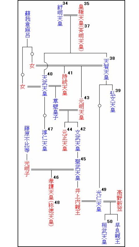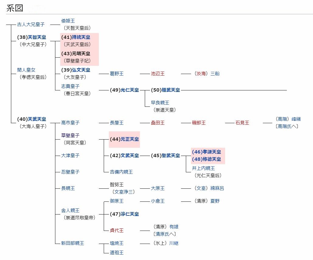 元明天皇は、日本の第43代天皇。 天智天皇の皇女。母は蘇我倉山田石川麻呂の娘・姪娘。持統天皇は父方では異母姉、母方では従姉で、夫の母であるため姑にもあたる。大友皇子(弘文天皇)は異母兄。天武天皇と持統天皇の子・草壁皇子の正妃、文武天皇と元正天皇の母。 藤原京から平城京へ遷都、『風土記』編纂の詔勅、先帝から編纂が続いていた『古事記』を完成させ、和同開珎の鋳造等を行う。 和風諡号は日本根子天津御代豊國成姫天皇である。(ウィキペディアより)