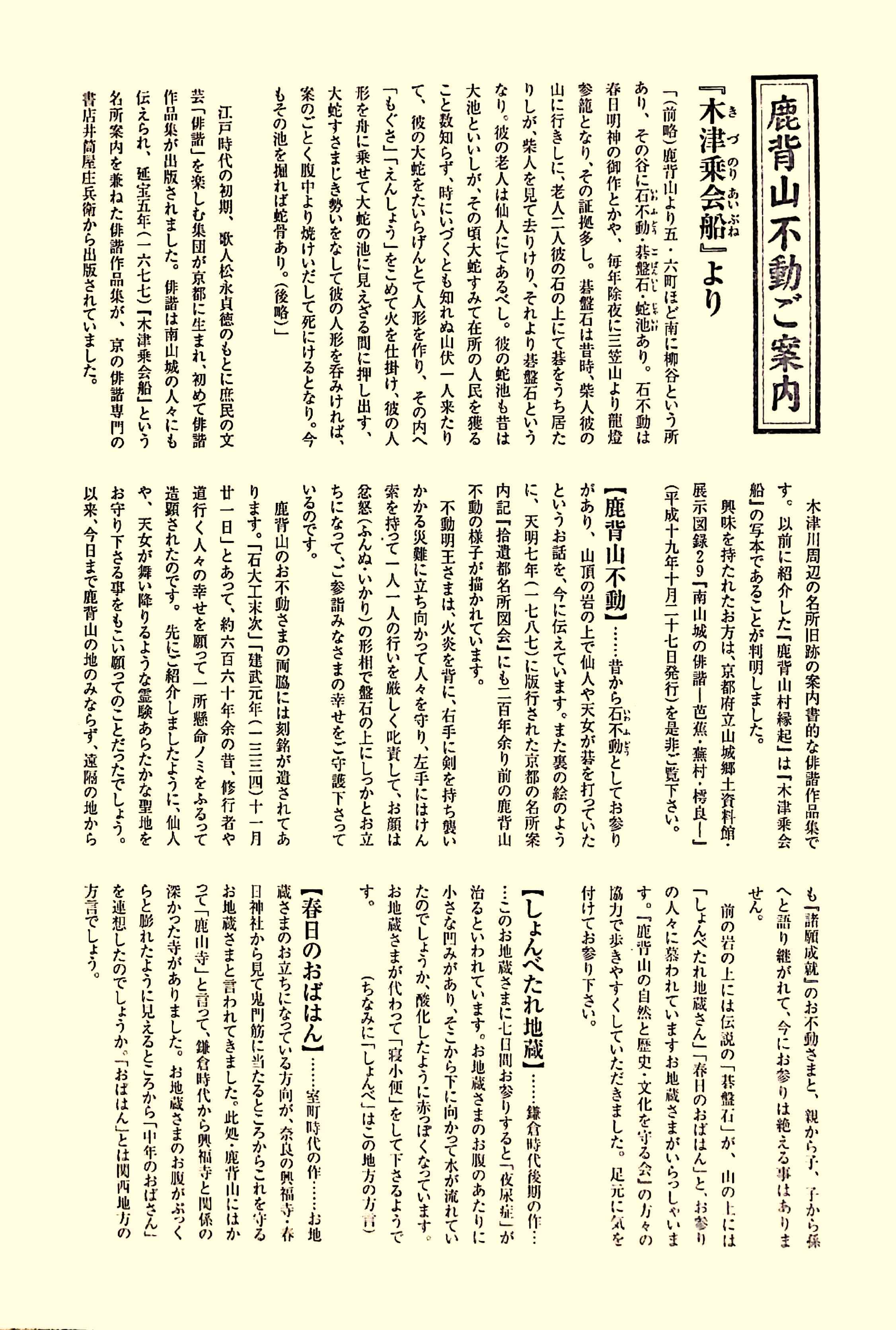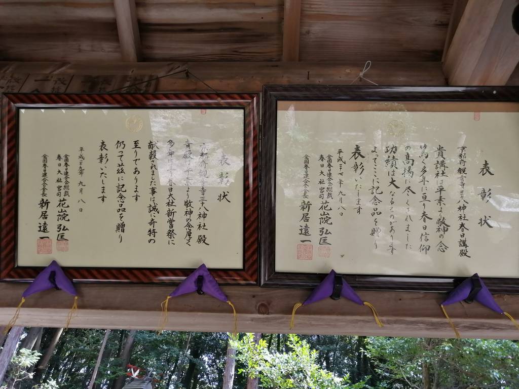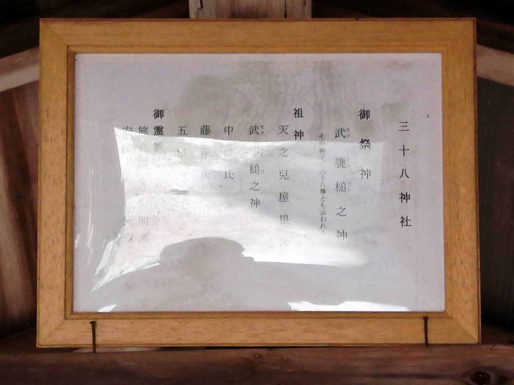 【御祭神】 武甕槌命 タケミカヅチノミコト 綿津見神 ワダツミノカミ 【由 緒】・・・がわからない net検索しても情報少ない が こんなのを見つける 「帝塚山大学文学部紀要」第36号抜刷 「京都府木津川市加茂町観音寺三十八神社における宮座の組織と神事」 が国会図書館にある 2年ぶりかな 午前中に関西館へ行く 受付でその本を探してもらうと書庫にあるので貸し出し申請してください と PCで申請手続きを教えてもらって 20分ほど待つ == その本から転載 == 三十八神社の由緒について確かなことはわからない。昭和六〇年、三十八神社屋根の葺き替え時、内陣から二〇枚の棟札が発見された。 報告書をもとに、造営、遷宮の関与者銘などを記したのが表2である。 最古は永正五年(一五〇八)のもので、「棟上げ御遷宮」と記載されており、これ以前に創建されていたことが確実である。 また、慶長三年(一五九八)の棟札には「三十八所大明神」とあり、三十八神社は三十八所大明神と呼ばれていたことがわかる。 現在、奈良の春日大社には末社として三十八所大神社があり、若宮神社のそばに、若宮一五社の一つとして祀られている。 三十八所神社に関する記事が「大乗院寺社雑事記」長享二年(一四八八)二月二四日の条にあり、次のように書かれている。 一吉野愛染之宝塔聖御嶽万タラ持来、拝見了、相語、上御前ハ 戌亥向也、南本地十一面、女躰也、率川也、中本地阿ミタ、 北本地地蔵、三十八所也、子守也、(後略) 吉野の愛染宝塔聖が持ってきた曼荼羅に、三十八所神社が描かれており、地蔵を本地仏とするという。 中世末まで興福寺一乗院門跡が金峯山寺検校を務めていた。 その関係もあり、春日社に吉野の三十八所神社を勧請し、末社として祭祀したことが推察される。 そしてさらに、春日社から興福寺領である観音寺に三十八所神社を勧請したということであろう。 加茂町内には三四社が存在するが、そのうちの一四社が春日系の神社であり、荘園領主である興福寺・春日社の影響がいかに強かったかが窺える。 また、村名となっている観音寺は、中世に東大寺、西大寺、興福寺の末寺となった。興福寺ゆかりの吉野金峯山寺と強く習合した三十八所神社を勧請し、 観音寺と三十八神社の神仏習合の形態を整えたことも考えられる。近世に観音寺は廃寺となり、観音寺旧蔵の観音菩薩像と十三重塔を地蔵院が引き継いだ。 吉野の三十八所神社の本地仏として描かれていた地蔵を寺名にした地蔵院であることにゆかりを感じる。 観音寺には近世の共有文書が豊富に伝えられており、その中に天保一四年(一八四三)の本殿造立に関する数点の文書がある。 そのうち、観音寺村の庄屋松本久右衛門が役所に提出した「三拾八神社普請二付願」には氏神三十八社が大破したため、南都春日小宮の榎本社の古社を もらいうけたい旨が書かれている。 現在、榎本神社は春日大社回廊内西南隅に鎮座し、春日山の地主神であったとされている。 また、同じく「氏神御上遷宮緒入用緒算用拜下遷宮入用物覚帳」には榎本御社寿代銀として銀七〇〇匁が計上され、村中の全員が南都に行って社を もらい受けたとある。近世後期にもなお、春日社との強い結びつきがあったのである。