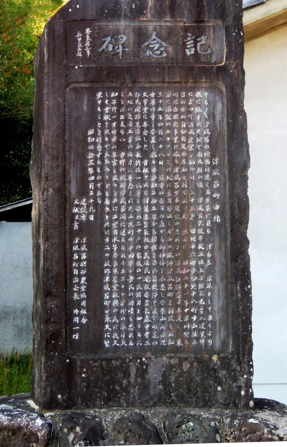 そもそも津風呂の地名は遠く萬葉集に見る 「津布呂」津振として古くより歌に詠まれた地で南北朝の頃 津風呂筑後守従五位上平朝臣光季入道覚佛によって治水産業を拓かれ 五十三戸 田地十六町歩畑地十一町歩山林二百町歩の自給自足の平和な村であった 然るに 昭和二十一年十津川紀之川綜合開発事業に依る津風呂ダム建設のためこの津風呂部落は水没し 裏面に銘記の二十戸がこの地に集団移住し第二の故郷津風呂町を創設し昭和三十五年四月二十八日 鎮守の春日の森から御神体を奉還し安楽山阿弥陀寺薬師寺を安置し我々は昭和三拾三年から移住を始め爾後汗と涙で町造の大事業に専念した 貢献された対策委員長阪口義雄氏建設委員長森中宇三郎氏開拓農協組合長乾俊一氏等を始め二十戸の家族の一致協力と加うるに土地の交渉工事の協力に専念された山陵町の中田宇之吉氏の功績も忘れることは出来ない 吉野の故郷津風呂湖に湛えられた三三〇〇万?の水は大和平野一万町歩の旱害を救うと共に工業用水等奈良県産業振興の為に幾久しく貢献されるであろうことを希うと共に第二の故郷津風呂町が永久に繁栄することを祈念するものである