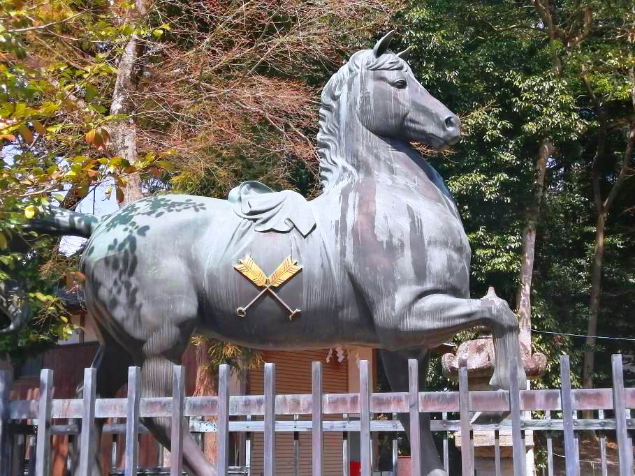 大正天皇ご即位祈念に献ぜられたる青銅馬一体、先の太平洋戦争末期供出の命を受け、国のために奉ぜる。 長らく石趺のみ残れるを痛み、之を再現す。平成二年九月吉日