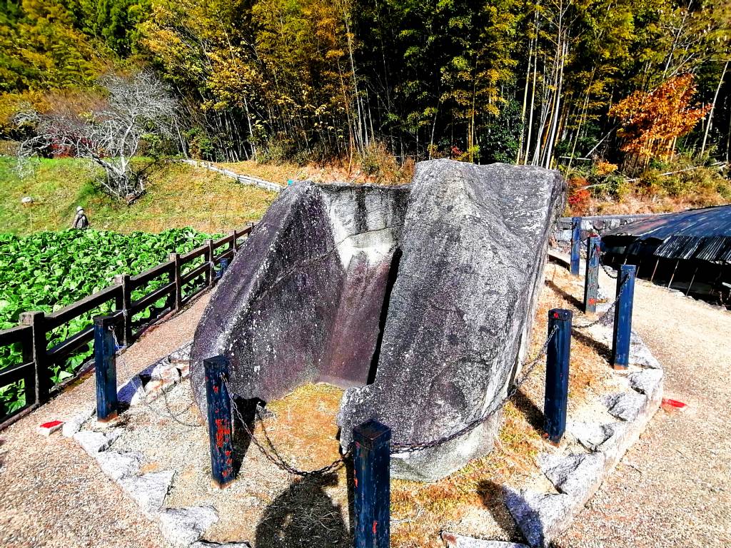 近くの水田から掘り出され、その形から猿石と呼ばれる石造物がここに置かれいる。