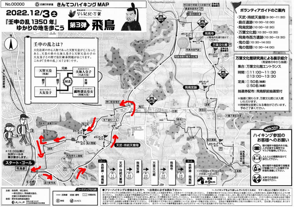 近鉄吉野線「飛鳥駅」→天武・持統天皇陵→亀石→( 島庄遺跡→飛鳥宮跡→万葉文化館→飛鳥寺→首塚・飛鳥寺西方遺跡