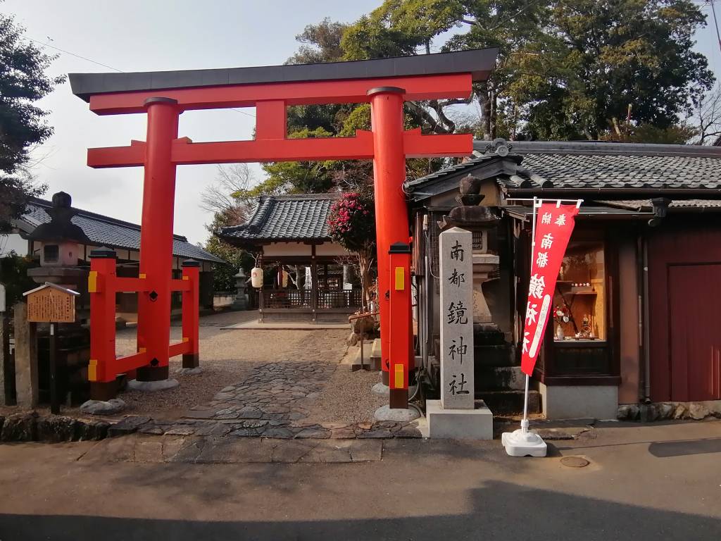 天平から天平神護年間(729年 - 767年)に、頭塔の近くにある清水寺(現:福智院)に玄昉の弟子報恩が肥前国唐津から鏡神社を勧請して祀ったのが始まりである。続いて、藤原広嗣の屋敷跡ともされる現在地に大同元年(806年)に移転し、新薬師寺の鎮守社とされた。