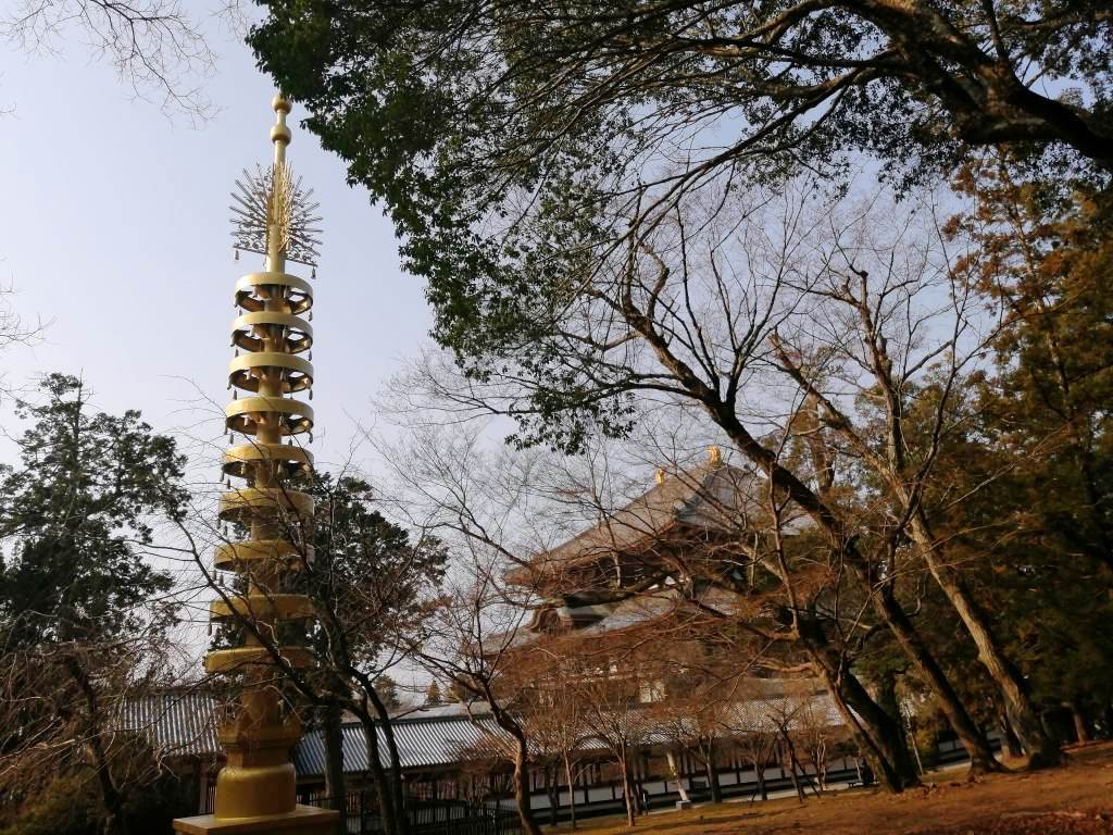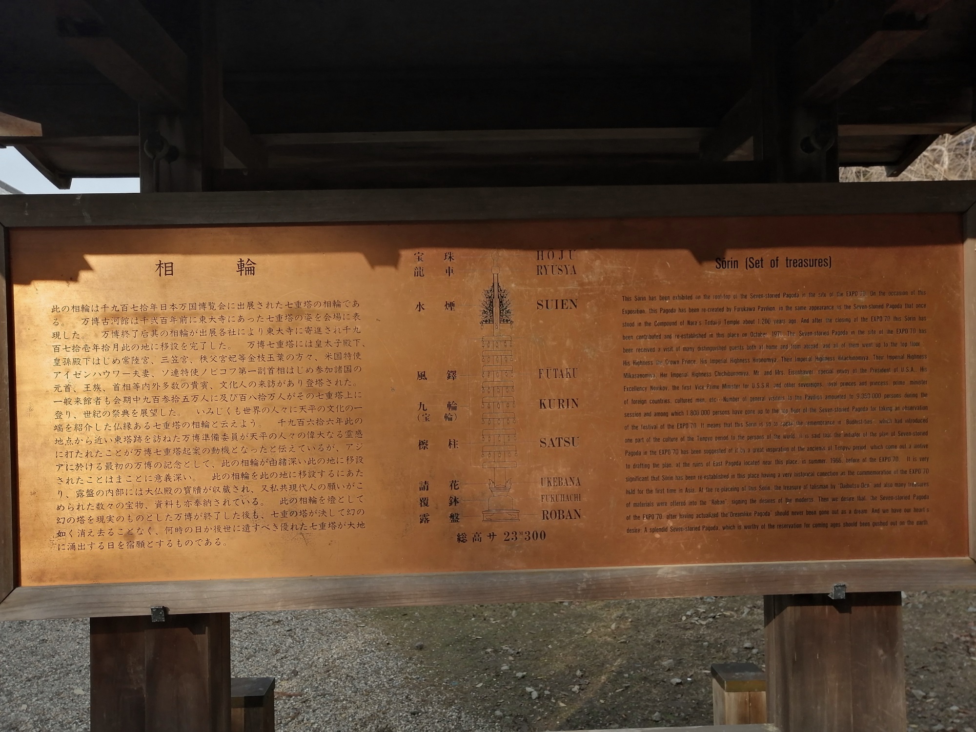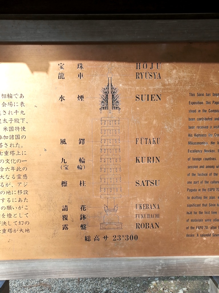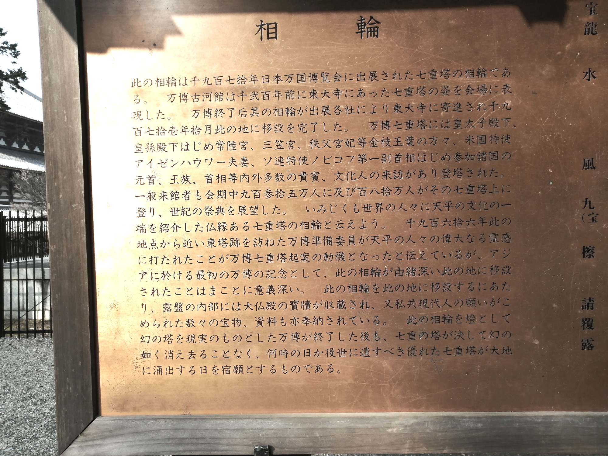 塔は万博終了後に解体されたが、相輪が東大寺に寄贈され、大仏殿のそばに建てられている。