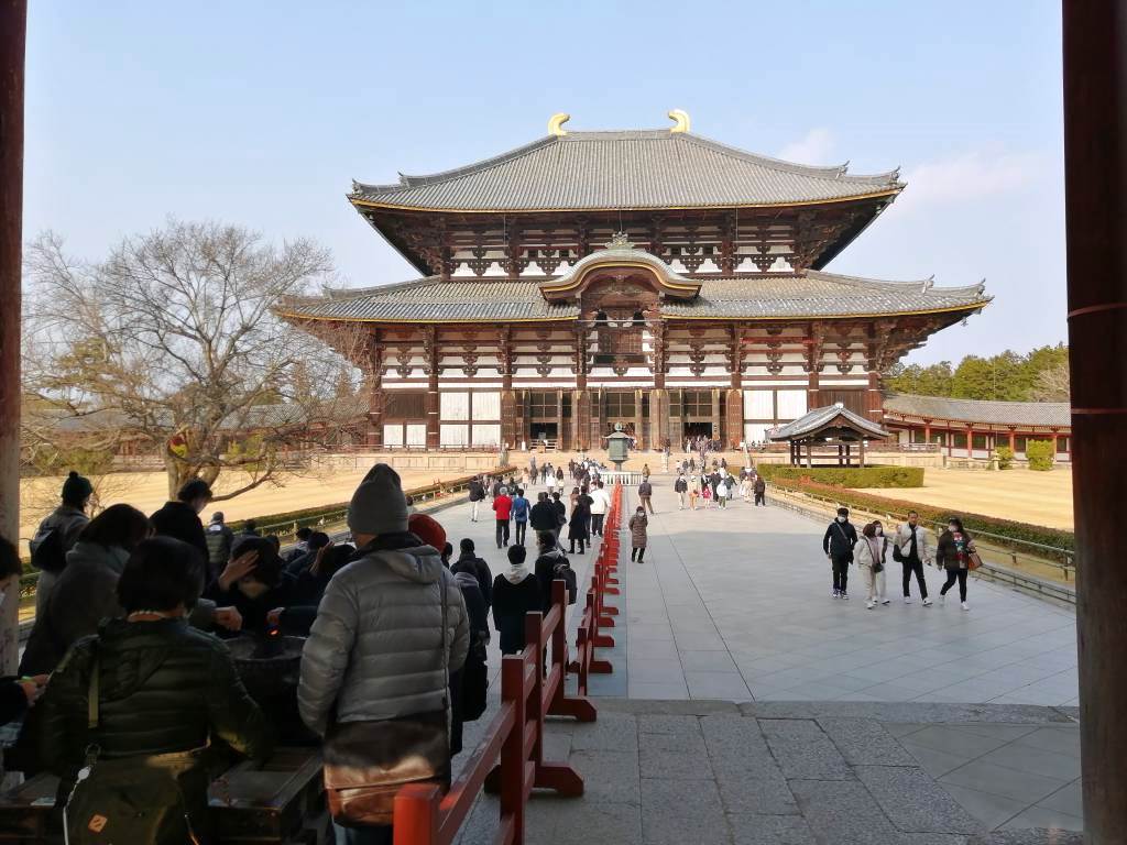 東大寺の金堂である。奈良時代に創建されてから治承と永禄の二度の兵火に遭い、現在の建物は江戸時代に公慶上人によって再建された。ただ天平・鎌倉の大仏殿は桁行11間(約88m)であったが、財政困難の理由で7間に規模が縮小された。それでも高さや奥行は創建時のままで、世界最大級の木造建造物である。