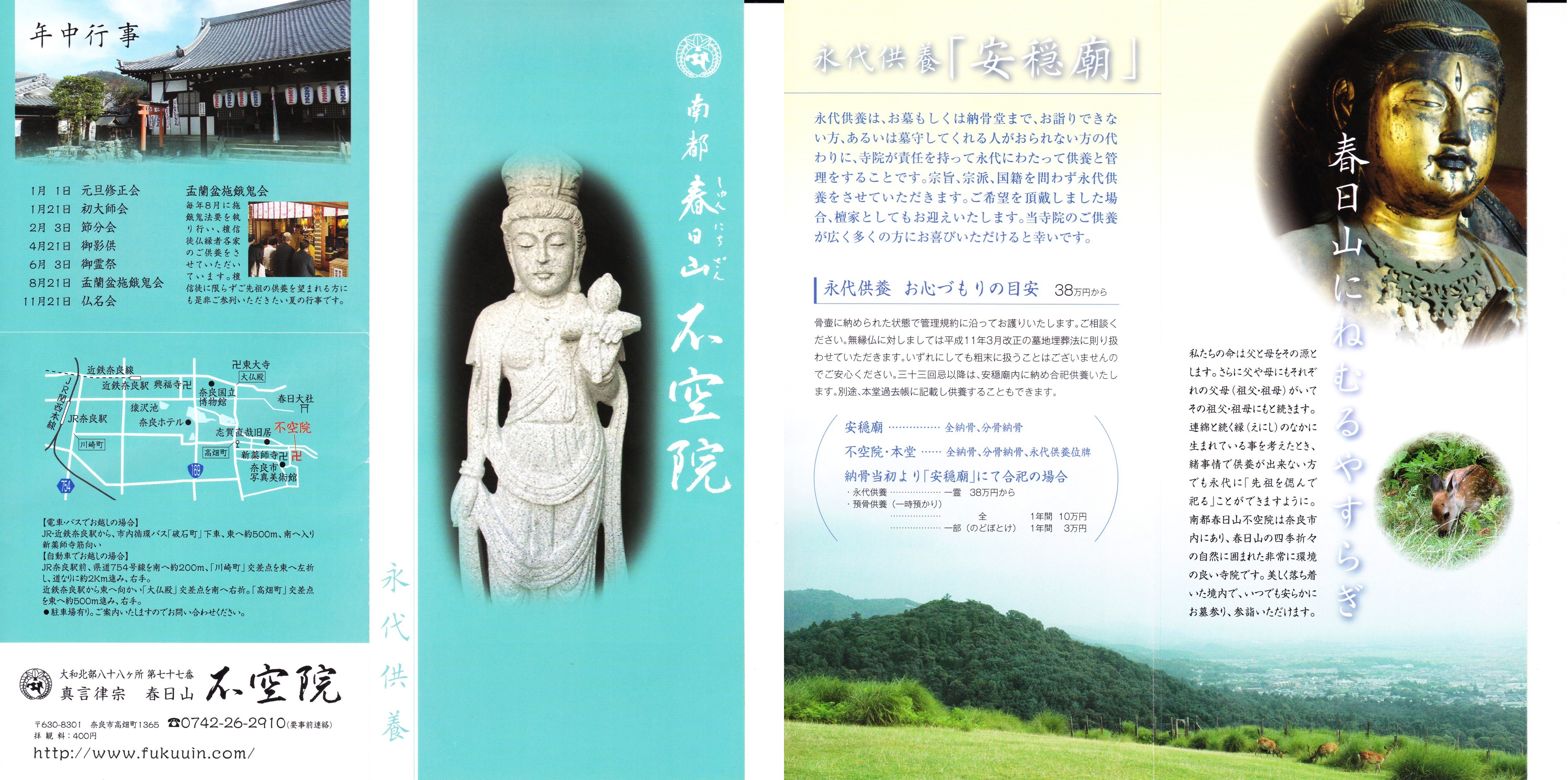 また平安前期(810-824 弘仁年間)には、弘法大師が興福寺・南円堂建立の試みとして、鑑真住房跡であるこの地に雛形の八角円堂の建立を提案して願文を書いたと伝わります。これが不空院の始まりといわれております。八角円堂はこの寺域に確かに建てられ、不空羂索観音が奉安された。八角円堂は江戸時代・安政の大地震で倒壊しましたが、不空羂索観音は現在も当山に御本尊として御座します。
