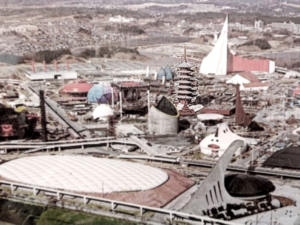 このため、生活の未来像を反映したコンピューター展示の「コンピュートピア」(コンピューターの世界)を収めた半地下式の展示室が、七重の塔の基壇として設けられた。この基壇は高さが10メートルで、周囲に池があった。