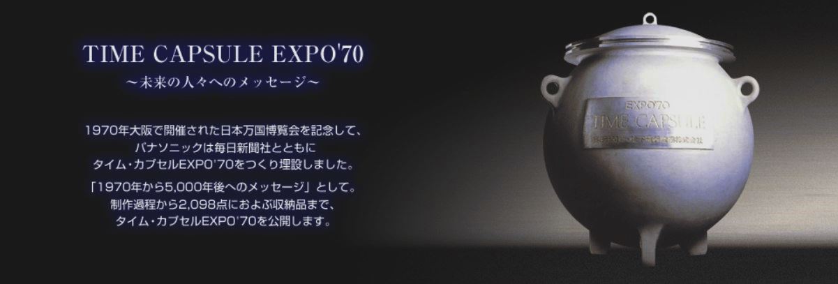 「人類の進歩と調和」をテーマとした日本万国博覧会を記念して、毎日新聞社と松下電器産業株式会社が同じ内容のカプセル2個を完成し、大阪城本丸跡の地下15mに埋設しました。