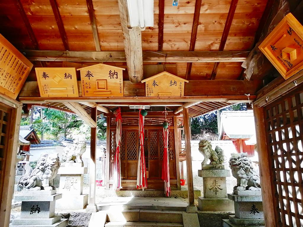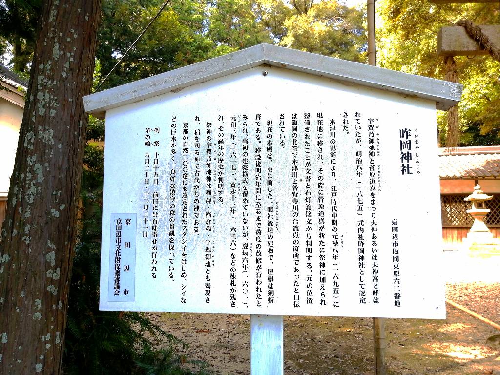 京田辺市の飯岡山の頂の東に東面して咋岡神社(くいおか じんじゃ)が建つ。なお、当社旧地(京都府京田辺市草内宮ノ後)に同社名の社がある。 菅原道真を祀り、天神、天神宮と呼ばれていた。 祭神は右に宇迦之御魂神(うかのみたまのかみ)、左に菅原道真。 式内社。平安時代、『延喜式』神名式(延喜式神名帳)』(927)中「綴喜郡 十四座 大三座 小十一座 鍬靫」の「咋岡神社」に治定されている。 ◆歴史年表 創建の詳細、変遷は不明。 室町時代、飯岡は北野社領であり天満宮(祭神、菅原道真)を勧請した。旧地は現在地の北、飯岡北端(草内宮ヶ森)にあり、木津川と普賢寺川の 合流点だったという。飯岡ほか二村の総社になっていた。 永亨年間(1429-1441)、木津川洪水により、田辺、草内、飯岡の三村に分祀された。この際に、宇迦之御魂神を勧請し、現在地に合祀される。 安土・桃山時代、1601年、修復されている。(棟札) 江戸時代、1617年、修復されている。(棟札) 1636年、修復された。(棟札) 1695年、木津川の氾濫によりこの地に移されたともいう。菅原道真が祭神に合祀されたともいう。 近代、1873年、村社となる。 1875年、式内社、咋岡神社と治定され社号を咋岡神社に改めた。 ◆建築 本殿は東面する。一間社流造、銅板葺。 ◆境内末社 伊勢社、八幡社、厳島社がある。 ◆飯岡 飯岡(いのおか)の地名由来について、古くは「咋岡(くひおか)」と呼ばれた。当社の「咋岡神社」の名も『延喜式』神名式に記されている。 平安時代、833年の『続日本紀』には「区ひ(田+比)岳」とある。 飯岡山についても、当初は「馬咋(うまくひ)山」「馬咋岡(うまくひおか)」と記され、後に「馬(うま)」が省略されて「咋岡(くひおか)」になった。 さらに、「く」が略されて「飯岡(ひおか/いおか)」になり、「飯岡(いのおか)」に転じたという。 ◆樹木 境内のスダジイは「京都の自然200選」に選定されている。シイの巨木がある。拝殿内には米寿を祝って奉納された額がたくさん懸けられています 額に枡を模った木枠と棒(杵・斗掻き棒)がつ いているのが特徴ですが これは山城地方に伝わるならわしだそうで、八十八と書いて「米」、食べるのに困りませんように…との願いが込められているのだそうです 今は一合升だけど、古くは一升枡を用いたとのこと