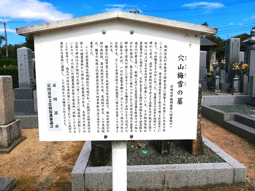 家康に随行して上洛し、近江国安土において信長に謁見。この後家康とともに堺を遊覧した翌日に、本能寺の変が起きた。すぐさま家康と共に畿内を脱しようとしますがその途上,草内で一揆に巻き込まれた、または明智光秀に家康を撃ち取るよう命じられた土民たちが家康と誤って撃ったなど諸説ある。(あるいは家康が梅雪を恐れて殺したとも。)悲運の武将として、飯岡の村人がこの地に手厚く葬った。
