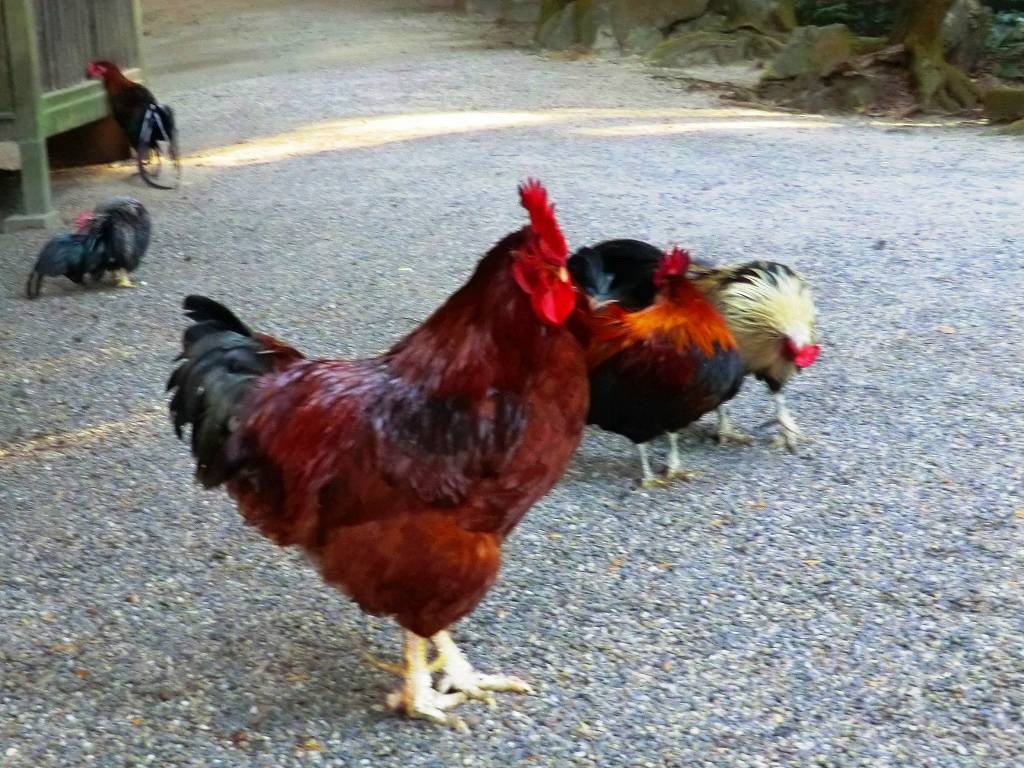 今から40年程前に奉納され、以後時々の奉納や自然繁殖、時にはイタチ、タヌキ、テンなどの小動物による被害を受け、羽数は増減しますが、大きく変ることはありません。