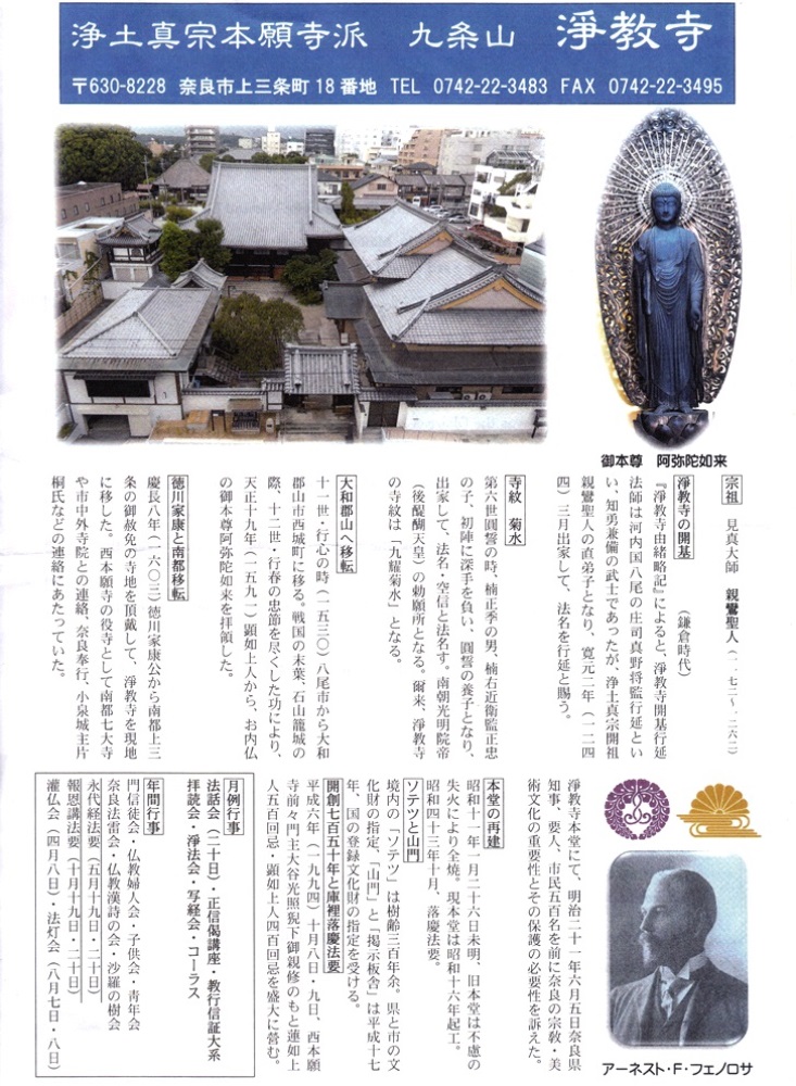 『 奈良の諸君に告ぐ!』 明治二十一年六月五日 アーネスト・F・フェノロサ 淨教寺本堂での講演要旨 通訳 岡倉天心 第一、 美術及び宗教に関する奈良と羅(ロー)馬(マ)の比較 知事及び諸君、回顧すれば一周年前、余は欧州ローマの都府に遊び古物の研究をなしたり、然(しか)るに今また、日本のローマなる、此(この)奈良に来り、 古物取調べに関し、諸君と相見るの栄を得たるものは、もことに偶然ならざるものあるが如く、余が深く歓喜するところなり。そもそも、美術と宗教に関し 奈良はローマと何ぞその事の相似たるや。かのローマは今日のヤソ教(キリスト教)の古寺院多く存在せり。ローマは有名なる帝都なれども、一旦亡滅に帰 せしより後は寥々として世に知れざることや久し。その隆盛の時に当りてや、人口百万の多きを有せしも、その極衰の時にありては、わずかに五千の人口を もつに至れり。この奈良の如きも、さしも有名の帝都なりしも、平安遷都の後は実に寥々の故国たるに過ぎずその形勢はローマ都府の衰時と一般の光形なり。 しかれどもローマは奈良になき所の、非常なる好機会に遭遇するを得たり。好機会とは何ぞや。ローマ法王と中央ヨーロッパの諸王と連合し、ローマを以て 中央ヨーロッパの都府となしたることこれなり。但し、奈良の如きは再び政権の中心たるを得ずといえども、なお宗教に関しては要用なる中心の地位をもち たり。而してローマが、政治上に、この幸福を有せしのみならず古昔の事物を探究して歴史宗教共に大いなる影響を及ぼせり。その故は、ローマに湮滅(い んめつ)せる古代の遺物を探究して歴史宗教共に大いなる発明をなし、文学風俗の改良を図ることを得たればなり。 第二、 奈良と中央大陸の関係 ローマは四百年来、あたかも世界の貴重物を保存せる宝庫の如き有様なりし、而して、これを利用したるものは後世の人なり。この古物を研究するの流行の びて欧州の大陸に波及し、遂に開花の性質を変改するに至れり。故に、現今欧州に行わるるところの風俗及び宗教は、みな当時に発明したるものによりて興 りたるなり。今日の奈良は、日本に向って、このローマたるを得べきや否やは、目下推究すべきの一要問題なりとす。 今この奈良に残り伝わるところの古物の思想は全く後人の思想になきところのものなり。何となれば近来こそ、ようやく古物をも探究し、この奈良の有様を も探知したれ。徳川時代の人は奈良は如何なるものなるや、如何なるものが奈良に存するや茫乎として、これを知らず。三百有余年を経過せり。故に古人の 思想は如何なる思想なるや。夢にだも知る能わざりしなり。この時間、奈良の古物が世に知られざりし有様は、あたかもローマの古物が土中に埋もれていた るの時と一般なり。もし、正倉院の宝庫にてもなかりしならば日本古代の開花は如何なる有様なりしやを知るに、ほとんど由なかるべし。 奈良はローマが復古せし時の如く再興してただちに、その影響を全国に及ぼすが如きは望むべからざるも、追々古代の事物を探究せば、その重なるものの内 には日本の制度その他久しく廃絶せし事物を発明復古して、遂には世上に革新の功を及ぼすことあるべし。故に今日の要務は第一に古人が奈良の開明を先導 せし事業の精神は如何なるかを考究せざるべからず古代の遺物によって、これを見る時は古人が生活の有様は如何なる度にまで達したりしやを知るに足るべ し。顧うに日本開明の遠因、すなわち文明東漸の原因はギリシァの歴山帝が東征して文明の種子を印度に遣わしたるに起り、それより支那高麗を経て日本に 伝えたる証述は歴々として、微するに足る古代日本人の美術思想の純粋は全くギリシァ美術の純粋と同一轍なりし事はこれを今日に存在せる銅像彫刻の精妙 に微して照々見るべし。その彫刻は、すなわち其人の性質思想を表示して、当時の美術いささかも欧州に劣らざるを見るに足れり。アジア佛像的美術は、こ の奈良に於て完全せりというも決して溢言に非らざるを信ずるなり。 そもそも奈良は独り宗教と美術の上のみならず、その他歴史上にも中央大陸と大なる関係をもてり。その故は、中央アジアの諸国遠きペルシャの如きより文 明の種子を持来し、この奈良の装飾をなしたり。しかるに、当時文明の種子を持来したるこの諸国は今日如何の有様なるやというに多くは亡滅して存せず。 あるいは今日に探究の縁なく、あるいは戦乱革命を経て旧時の面目を存せず。当時の事物は独り日本にのみ存在せり。故に当事の事物を見んと欲するものは 、 第三、 古物活用の要訣 日本の奈良に来らざれば、これ見る能わざるなり。故に正倉院の宝庫等に入りて、古代の遺物を見るは、あたかも欧州の学者が地中より古代の物を掘出して、 これを見るに異ならず。実に奈良は、中央アジアの博物館と称して不可なきものなるべし。今日日本が奈良の古物を調べて古代の事を発明するは欧州の学者 がローマの古物を調べ