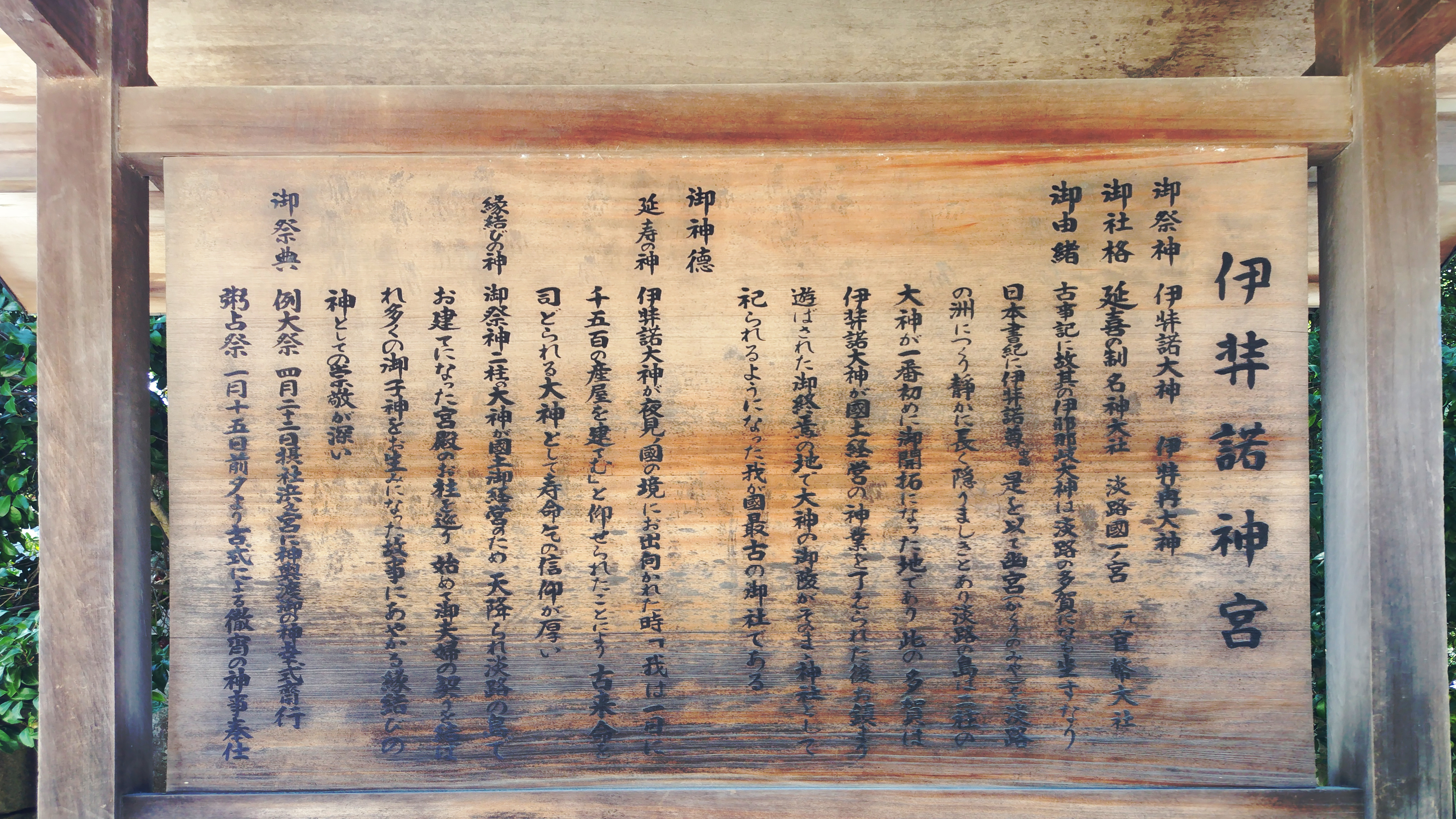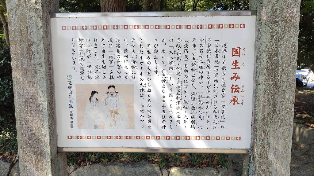 【 祭 神 】 両神は日本神話の国産み・神産みに登場する。 伊弉諾尊(いざなぎのみこと) 伊弉冉尊(いざなみのみこと) 【 創 建 】 『日本書紀』・『古事記』には、国産み・神産みを終えた伊弉諾尊が、最初に生んだ淡路島多賀の地の幽宮に鎮まったとあり、 当社の起源とされる。 伊弉諾尊の幽宮と伝わる場所は、他に滋賀県の多賀大社があるが、これは『古事記』の真福寺本の「故 其伊耶那岐大神者坐淡海之多賀也。(いざなぎのおおかみは あふみのたがに ましますなり)」との記述による。 ただし、多賀大社の祭神は南北朝時代の頃までは伊弉諾尊ではなかったことが判明しており『古事記』の記述と多賀大社を結び つけることはできない。 『古事記』では「近江」は「近淡海」とするのが常で、同じ『古事記』でも真福寺本以外の多くの写本が「故其伊耶那岐大神者 坐淡路之多賀也。」になっており、その他の諸々の理由から、学界でも「淡海」でなく「淡路」を支持する説が有力である。 なお、『日本書紀』では一貫して「淡路」と記され、「近江」に該当する名はない。(Wikipediaより)